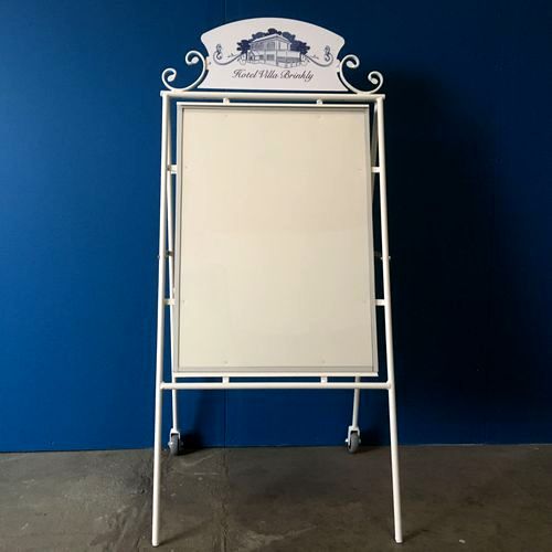 Hjul er ekstra tilbehør. Plastforsider med magnetkant medfølger. For hjul, blomsterkasser, sort skiltepapir, fakler og flag se under skiltetilbehør.